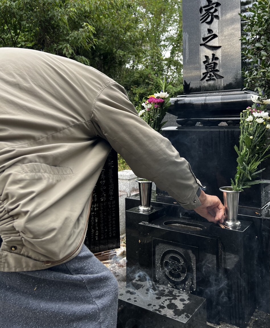 仏花を添え、線香を焚き手を合わせる後ろ姿は、先ほどまでとは違い凛とされていました。