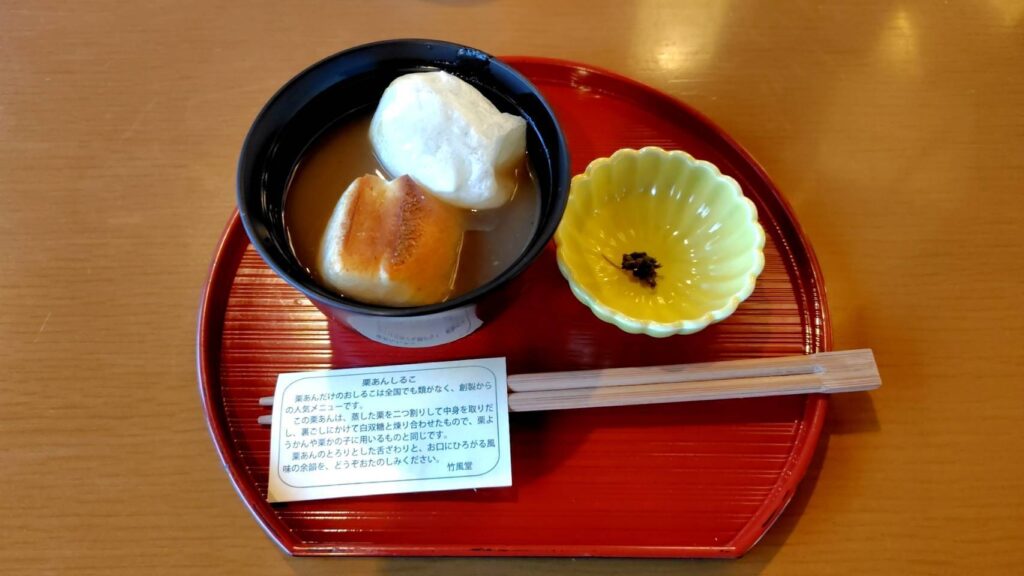 隣に添えられている紫蘇の実の塩漬けが、栗ぜんざいの甘さを引き立て、非常に美味しかったです。