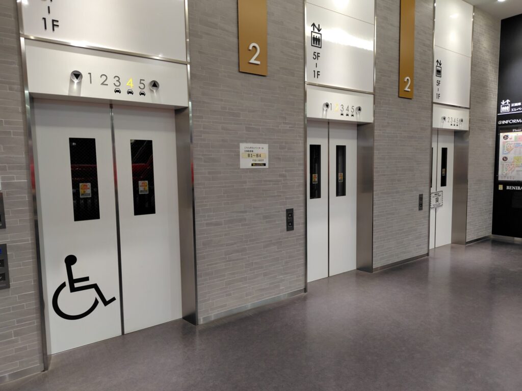 エレベーターも、各場所三機設置されていて、うち一つが車椅子用になっていました。