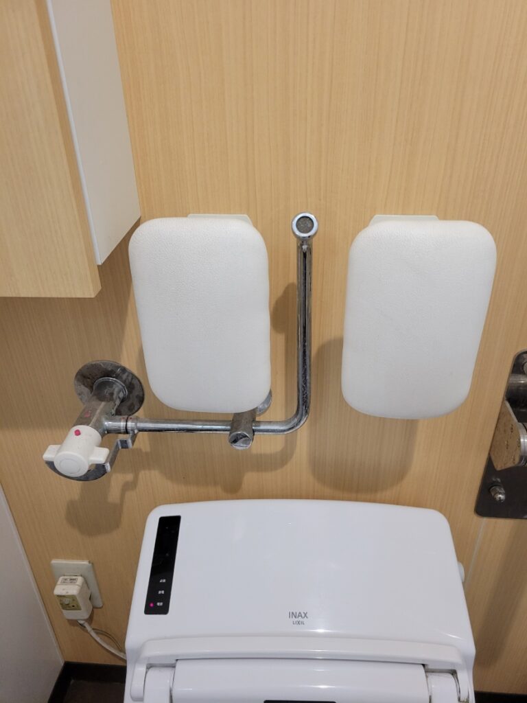 トイレ内に手洗い有、車椅子でも足が当たらず使用できそうです。